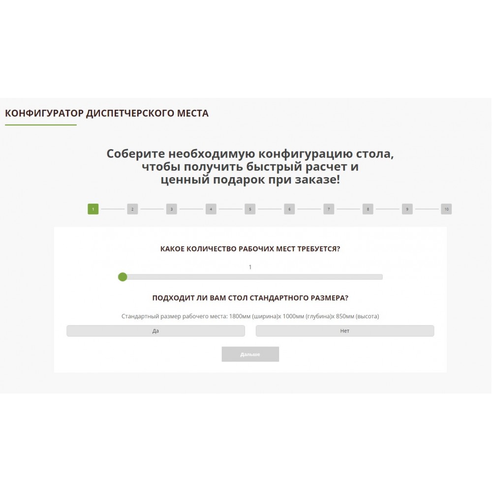 Квиз-опросник, который позволяет клиенту быстро и просто выразить свои пожелания при заказе диспетчерской мебели.
